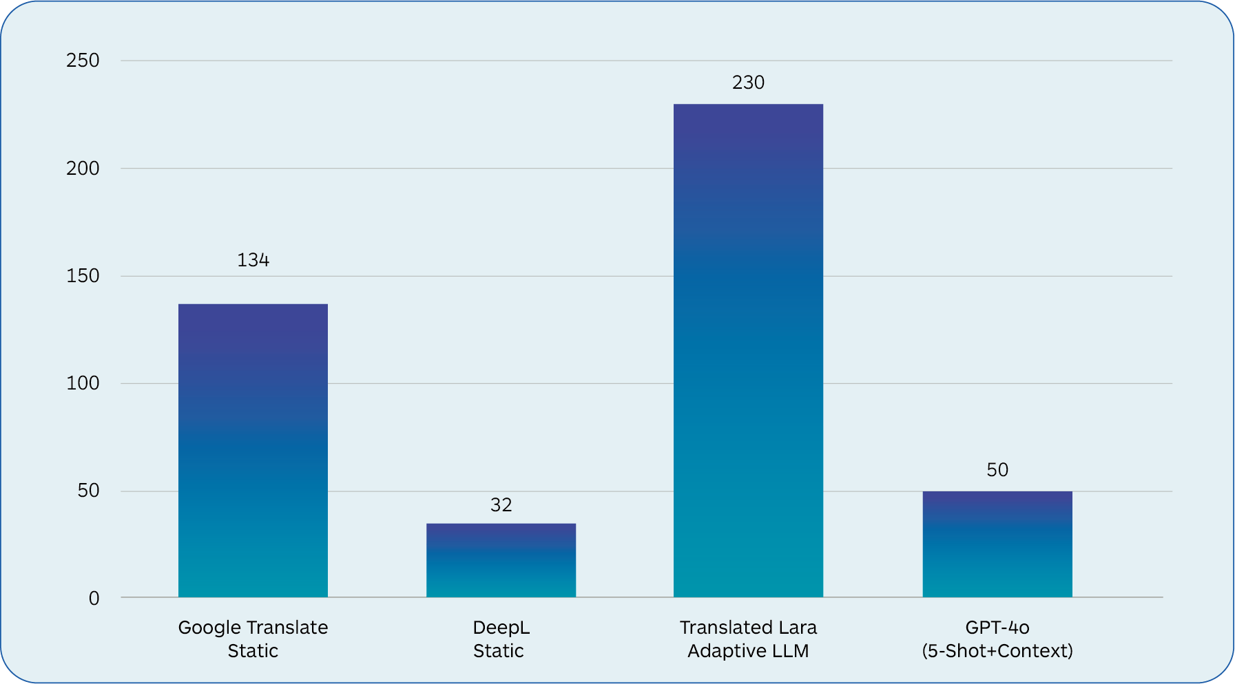 LLMs like GPT-4o have higher costs and latency compared to traditional NMT models. A custom LLM fine-tuned for a translation task, powered by expert-trained prompts, and provided with translation memories and source context, such as Translated’s Lara, performs best in cost, quality, and latency. It will generate cost savings in production enterprise settings as it will require less human oversight and corrective efforts.