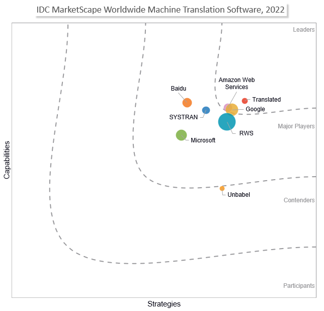 Translated has been recognized as a Leader in the MarketScape “Worldwide Machine Translation Software 2022 Vendor Assessment” (Doc #US48325622, December 2022) by IDC, the premier global provider of market intelligence and advisory services for information technology. The study evaluates companies in machine translation (MT) on the capabilities of executing clients’ projects and alignment with their future requirements. This recognition follows the mentions Translated recently received by Intento and Gartner for machine translation quality and AI-powered translation services.